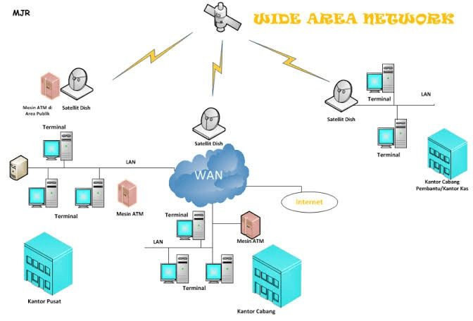 Menurut wikipedia, pengertian WAN (Wide Area Network) adalah sebuah jaringan komputer yang mencakup area yang besar, sebagai contoh yaitu jaringan komputer antar wilayah, kota, atau bahkan negara, atau dapat didefinisikan juga sebagai jaringan komputer yang membutuhkan router dan saluran komunikasi publik. Jaringan WAN membutuhkan fasilitas transmisi yang besar. Misalnya seperti satelit, kabel bawah laut, dan telepon. Jaringan WAN digunakan untuk menghubungkan beberapa jaringan LAN agar pengguna komputer di lokasi yang satu dapat berkomunikasi atau bertukar data dengan pengguna komputer di lokasi yang lain.