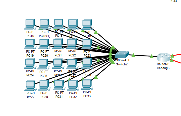 Di Cabang 2, kita membutuhkan 20 komputer yang terhubung dengan kabel. Jadi yang kita butuhkan adalah 1 router, 1 switch, dan 20 komputer. Dalam paket tracer akan menjadi seperti ini.