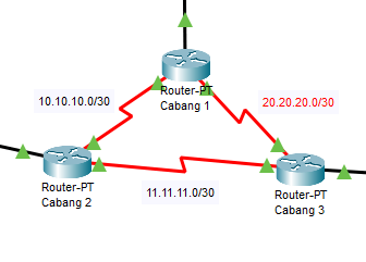 Hubungkan ketiga router tersebut menggunakan kabel serial DTE, sehingga akan menjadi seperti ini