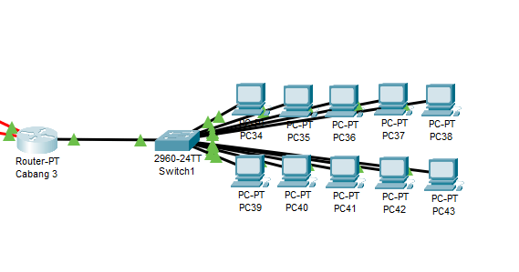 Di Cabang 3, kita butuh 10 komputer yang terhubung dengan kabel. Jadi kita butuh 1 router, 1 switch, dan 10 komputer. Dalam paket tracer akan menjadi seperti ini.