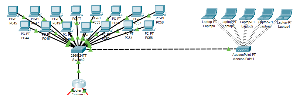 Di Cabang 1, kita membutuhkan 14 komputer yang terhubung dengan kabel dan 5 laptop laptop yang terhubung dengan wifi. Dengan begitu, kita membutuhkan 1 Router, 1 switch, 1 Access Point, 14 komputer dan 5 laptop. Dalam paket tracer, akan menjadi seperti ini
